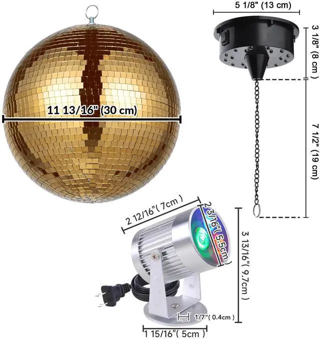 - Disco Ball Kit - Yescom Mirror Ball kit comes with a 12" golden mirror ball, 2 RGB spotlights, and a rotating motor for creating a dynamic display for bars, nightclubs, etc.