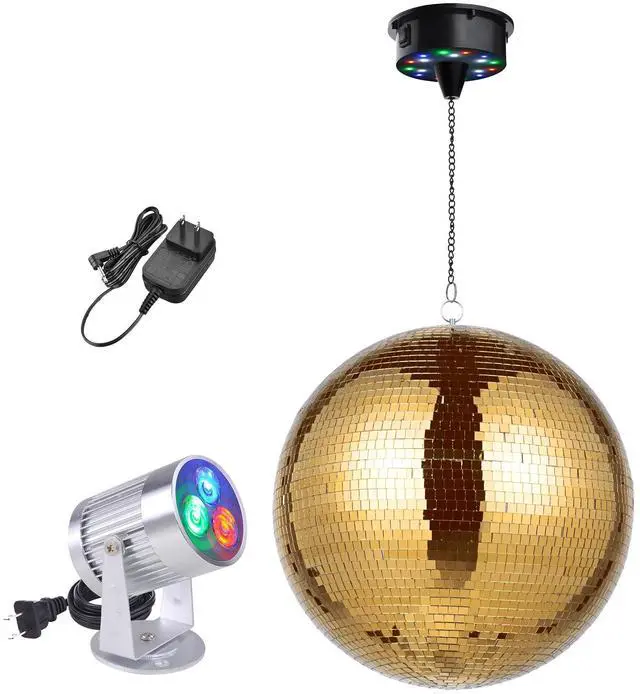 - Disco Ball Kit - Yescom Mirror Ball kit comes with a 16" golden mirror ball, a RGB spotlight, and a rotating motor for creating a dynamic display for bars, nightclubs, etc.
