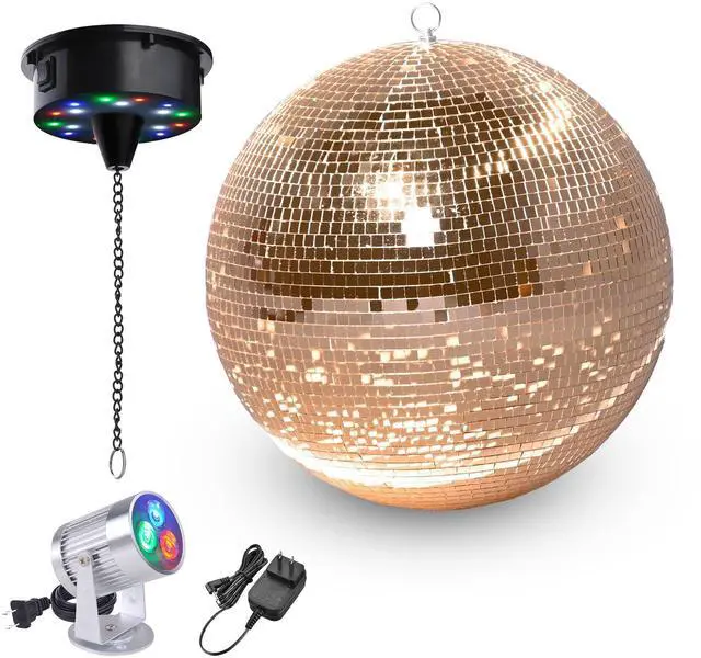- Disco Ball Kit - Yescom Mirror Ball kit comes with a 16" rose gold mirror ball, a RGB spotlight, and a rotating motor for creating a dynamic display for bars, nightclubs, etc.