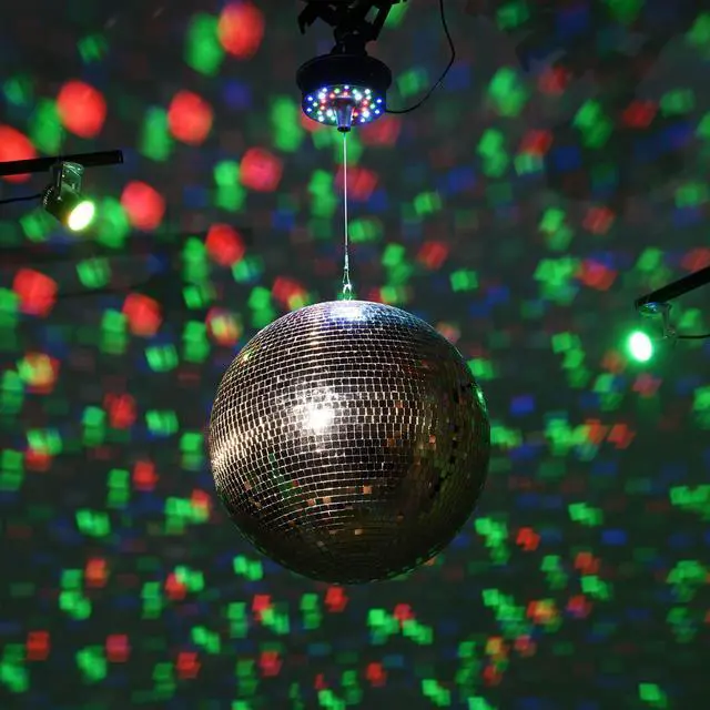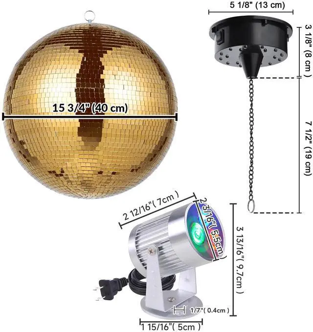 - Disco Ball Kit - Yescom Mirror Ball kit comes with a 16" golden mirror ball, 2 RGB spotlights, and a rotating motor for creating a dynamic display for bars, nightclubs, etc.