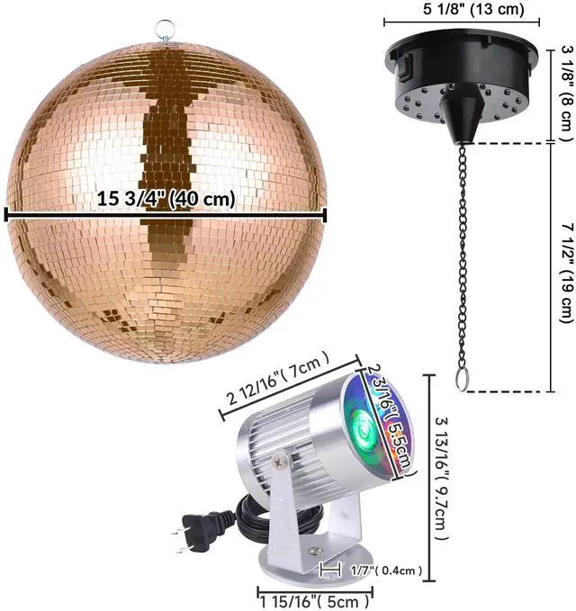 - Disco Ball Kit - Yescom Mirror Ball kit comes with a 16" rose gold mirror ball, 2 RGB spotlights, and a rotating motor for creating a dynamic and mesmerizing display for bars, nightclubs, etc.
