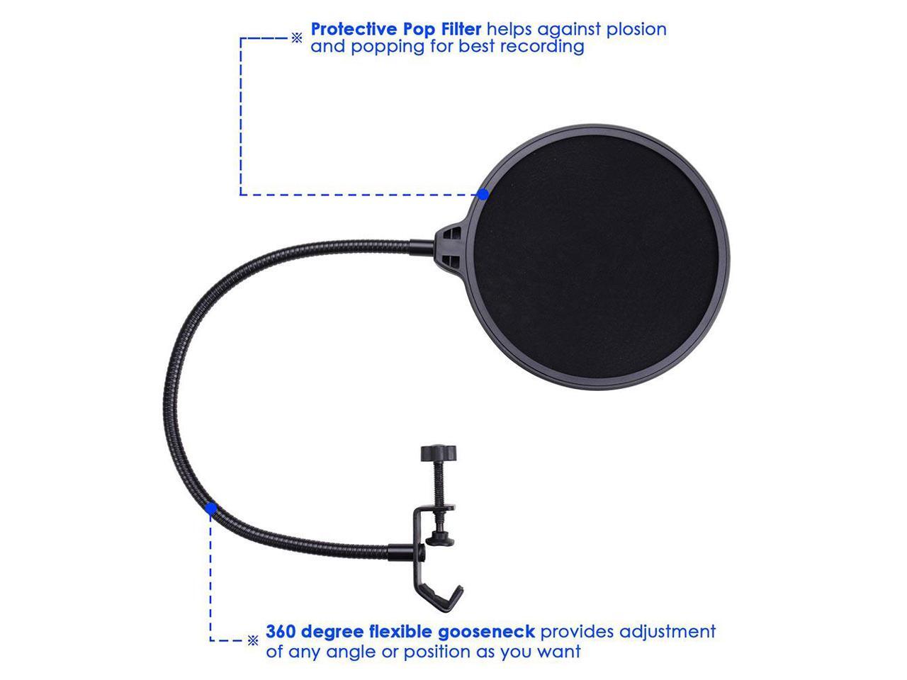 - A pop filter with 360-degree adjustable gooseneck for eliminating popping sounds
