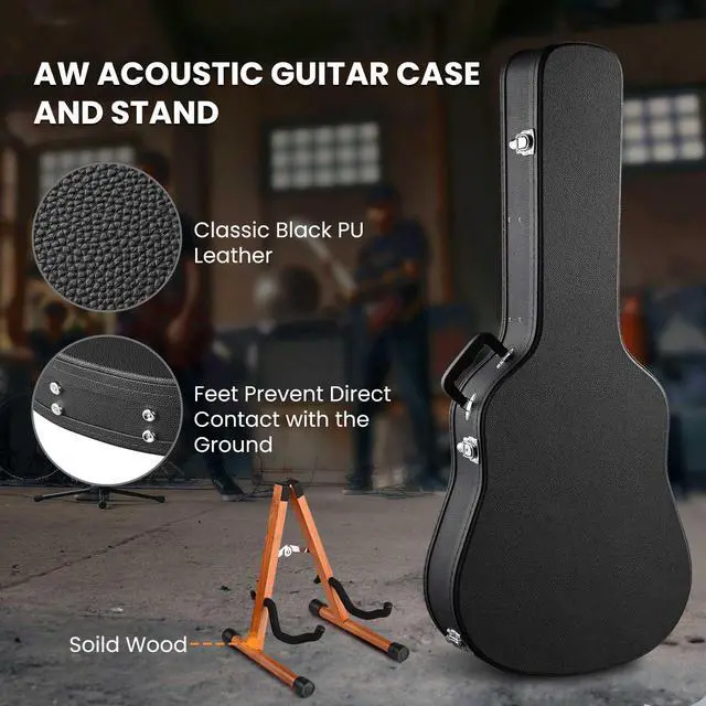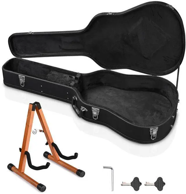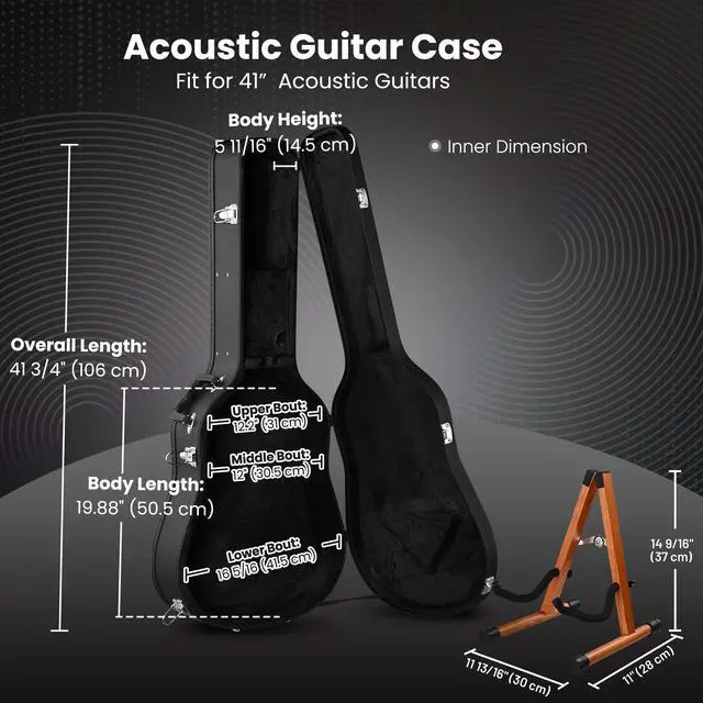 - Guitar Case & Foldable Stand Kit - Yescom guitar hard shell kit comes with a 43 3/8" x 18 1/2 x 6 1/2" acoustic guitar case designed for storing 41" acoustic guitars, along with a foldable wooden stand that features a wide and stable base with non-slip feet and foam-padded arms to hold your guitar safely