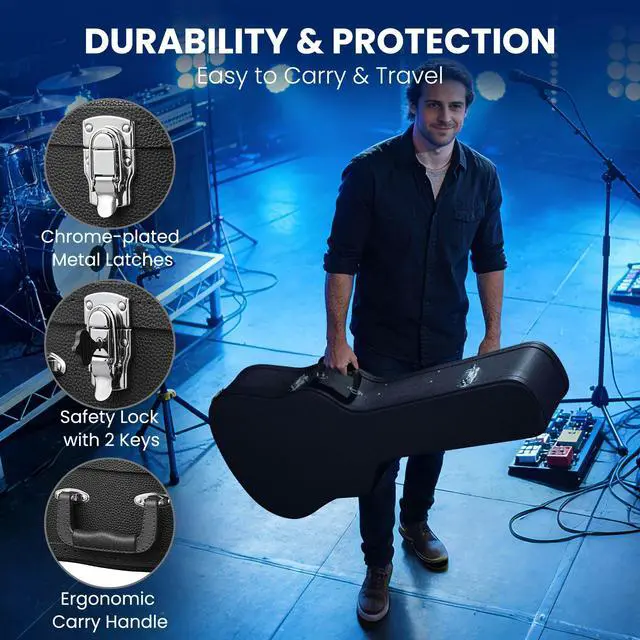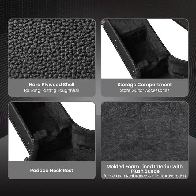 - Durability & Protection - The wooden case features hard plywood construction with PU leather wrapping, reinforced edges, and thickened latches, offering superior protection for your guitar during transport and ensuring long-lasting use, along with molded foam interior with suede lining for scratch resistance and shock absorption
