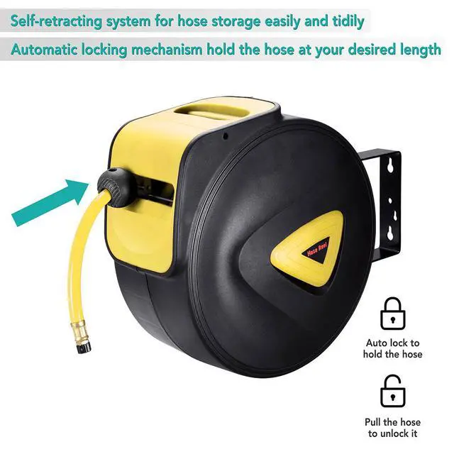 - Automatic Locking Mechanism - Comes with a 65ft hose and a convenient automatic locking mechanism which holds the hose at your desired length for easy and safe usage, unlockable by pulling or tugging on the hose