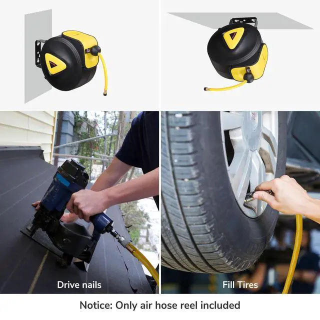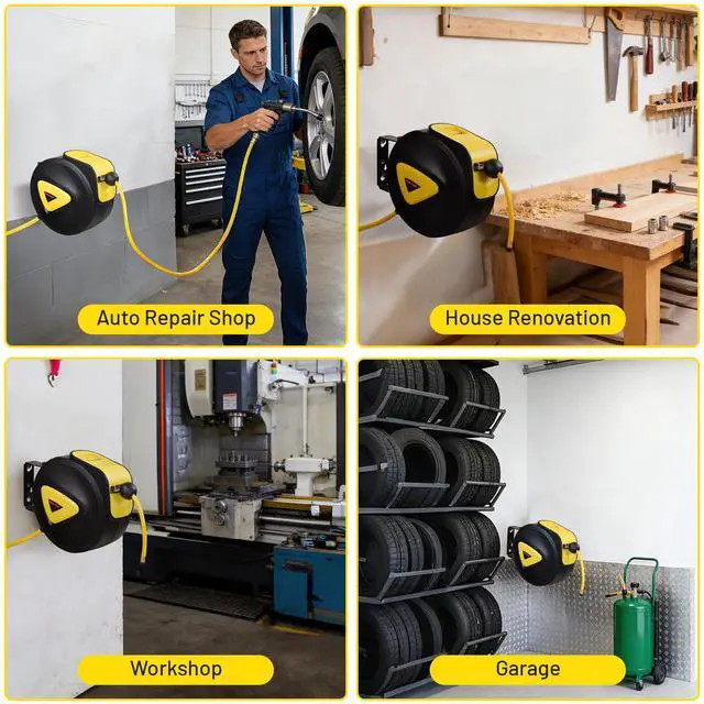 - Wide Application - This 65ft Portable Auto-Rewind Air Hose Reel is equipped with a retractable hose and a wall mounted bracket, ideal for storing air hoses and used in workshops, auto repair shops, 4S shops, garages, construction companies and sites, paint shops, tool rooms, gardens, etc.