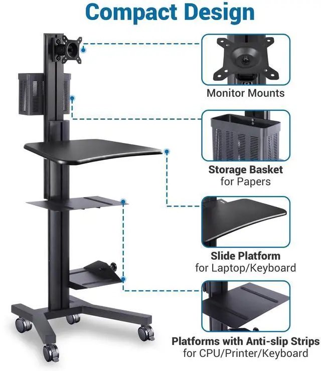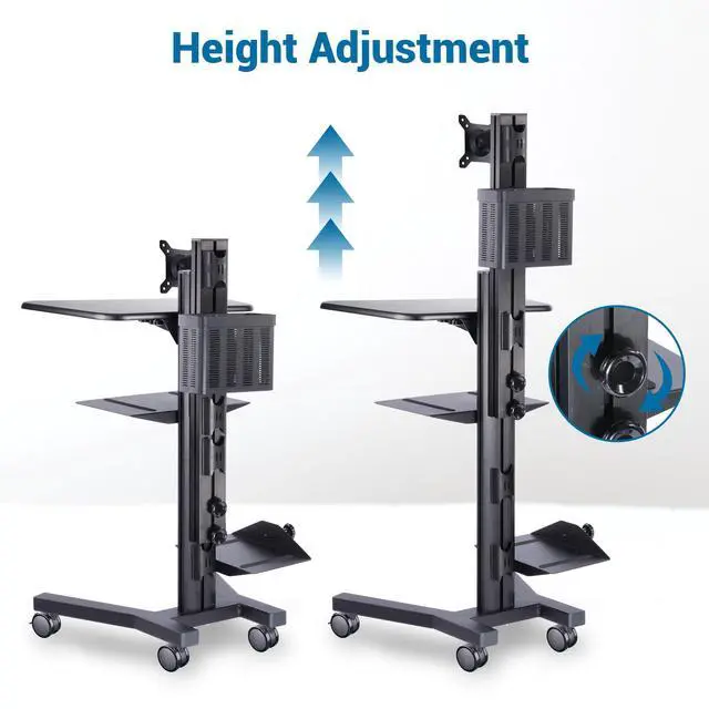 - Multi-Functional & Practical - 27"x25"x68" integrated PC workstation mobile cart with 4 wheels, monitor mount and several shelves provides an ample work surface and functional storage to keep all your equipment well-organized, saving space and easy to move, perfect for home, office, factory or more
