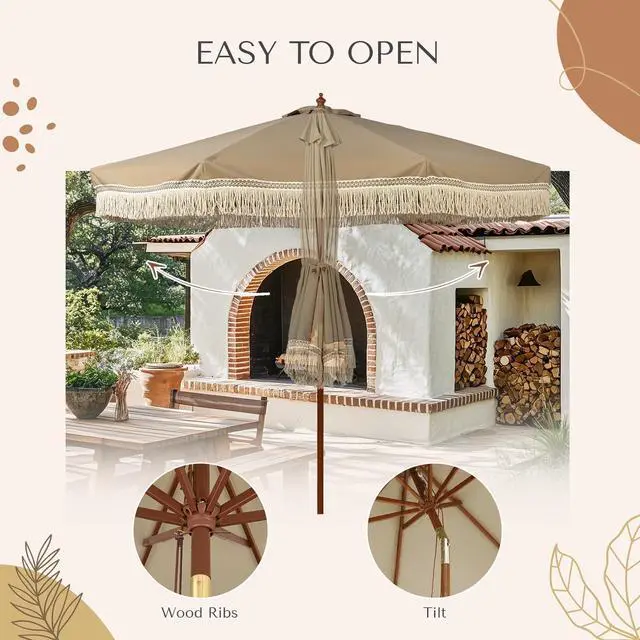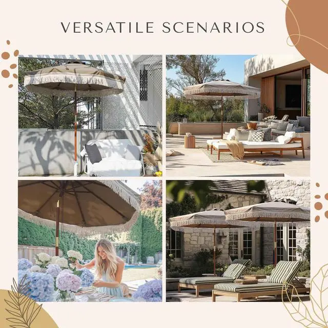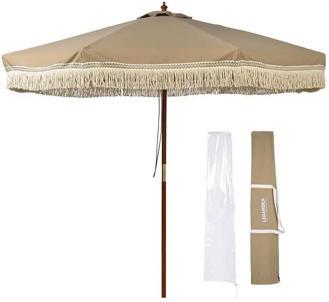 - 9FT LAGarden Boho Rustic Umbrella - Wooden frame, finial and cotton fringe bring a cozy rustic touch, create a Zen-like 3rd space where you can lay back and chill