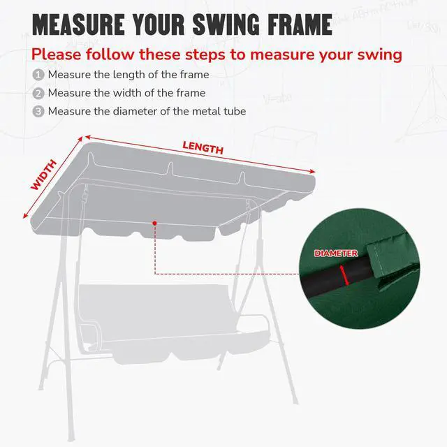 - Swing Necessary Accessory - Improves your swinging experience without much spend " effort as a useful replacement, a protective shelter " a stylish decor; Suitable for swing with 2 or 3 seat, please measure your swing top first, then make sure the top length is no more than 76 3/8", width equals to 44 1/8" " frame pole diameter is no more than 1"