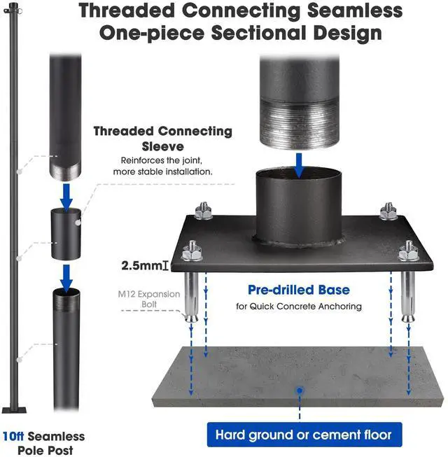 - Easy Installation - Easily mount support pole onto concrete or cement ground with screws depending on where your shade sail is located; Note: The pole is not recommended to be installed onto lawn unless pouring concrete over grass