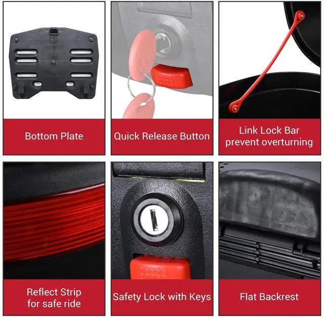 - Safety Assurance - Reflective strip on the tail box makes it visible when riding at night, providing a safe ride; Safety lock with 2 keys adds security to your personal items without theft; Flat backrest offers support to rest your back