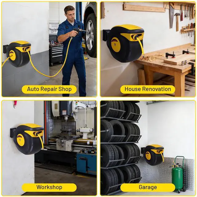 - Easy & Tide to Store - 100 ft portable air hose reel for compressed air, with retracting system for recoiling the hose automatically, keeping the hose tidy as well as saving time and effort from manually winding