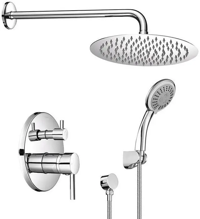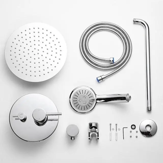 - Concealed Shower Faucet Set - Aquaterior Rain Shower System consists of a 10" round rainfall shower head, a handheld sprayer, a rough-in mixer valve, and a stainless-steel water hose, and boasts a sleek and concealed design for saving space and matching any modern style bathroom