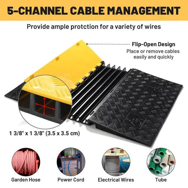 - Multi-Channel Cable Management - 5 internal channels neatly organize and protect power cords, data cables, garden hoses, and tubing up to 1 3/8" in diameter, eliminating trip hazards and preventing costly damage in high-traffic corridors