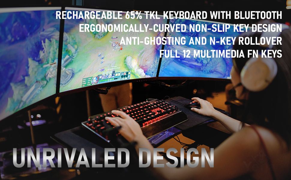 UNRIVALED DESIGN: 2000mA battery will provide ample 8-12 hours of untethered play on Bluetooth with backlight mode on. Ergonomically-curved non-slip key design plays through any games brilliantly especially with a compact 65% TKL design. Innovative Anti-Ghosting and N-Key Rollover technology designed for completely independent key scanning helps each keypress to be detected precisely. Features full 12 multimedia Fn keys