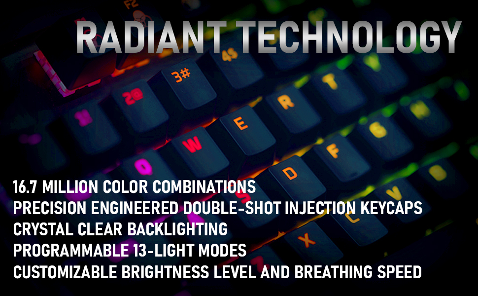 16.7M COLOR YEYIAN RADIANT TECHNOLOGY: Displays 6 colors of the spectrum plus white color capable of producing 16.7 million color combinations through precision-engineered ABS double-shot injection keycaps offering crystal clear uniform backlighting. Programmable 18-light modes offer fully customizable brightness level and breathing speed