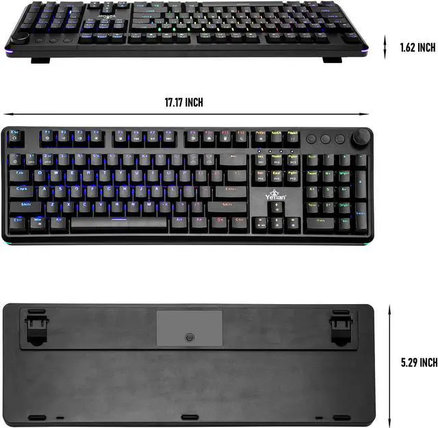 17.17" x 5.29" x 1.62" Keyboard, 5ft Tethered USB-A. Fully compatible with Windows 10/8/7/Vista/XP in all major brand gaming PCs and workstations. Comes with 1-year warranty on parts & labor.