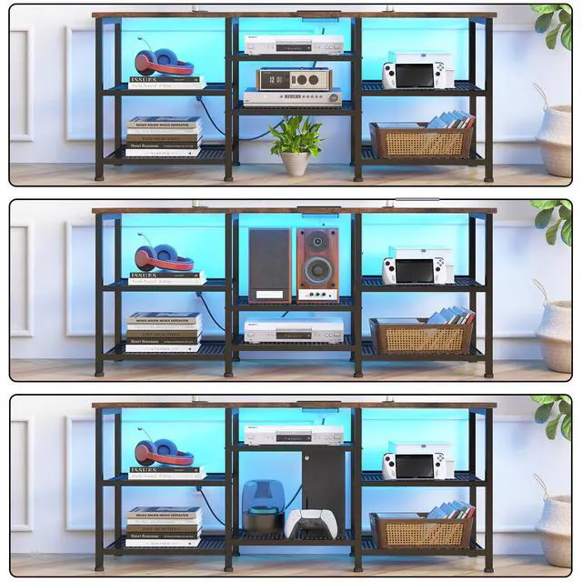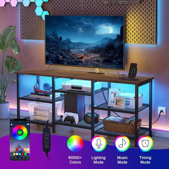 TV Stand with Charging Station: Our charging station has 2AC, 2USB, 1Type-C, it can meet most of your electricity demands. We also have changeable LED lights, you can choose different color combinations according to the decoration style when using it.