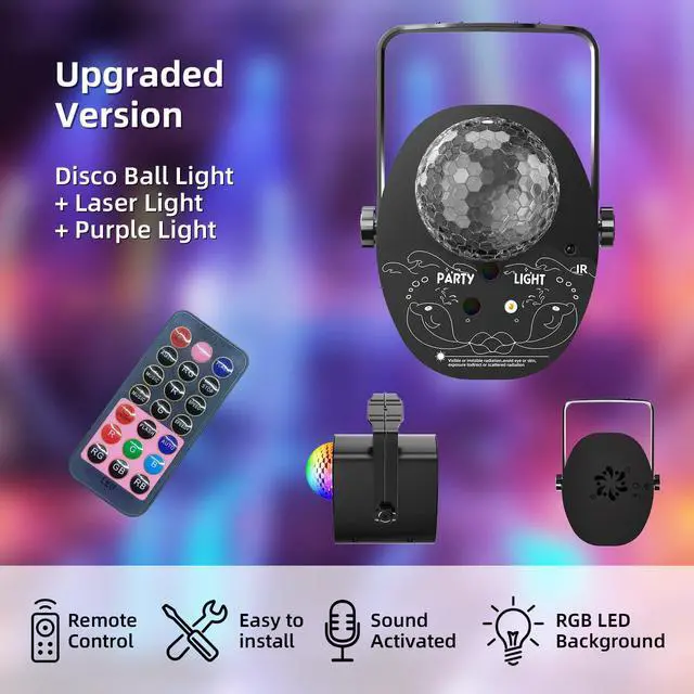 Disco Ball Party Lights with Multi-Color Laser Pattern Light for Parties Decor, Sound Activated Strobe Lights with Remote Control, Stage Light for Home Karaoke Dance Birthday Events & Nightclubs.