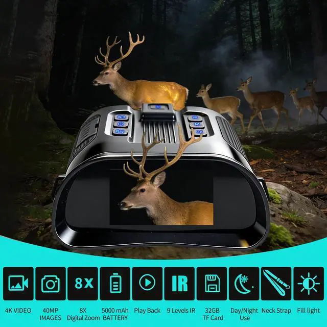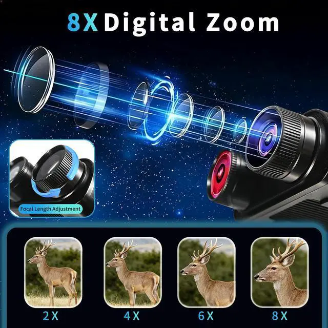 8X Digital Zoom Night vision goggles for adults 8X digital zoom lets you see distant targets without getting closergreat for observing skittish wildlife (like deer) or checking distant campground safety. Night vision binoculars adjust the zoom easily with one hand, and pair it with the focus gear for sharp, clear views every time