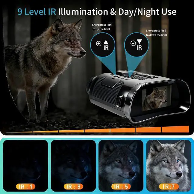 9-Level IR + Day/Night Use Why buy separate day and night gear? Our goggles work in sunlight and darkness (9-level IR). Night vision scope use low IR for stealthy animal watching, high IR for long-distance night viewsone device covers all your outdoor needs, from morning hikes to night security checks