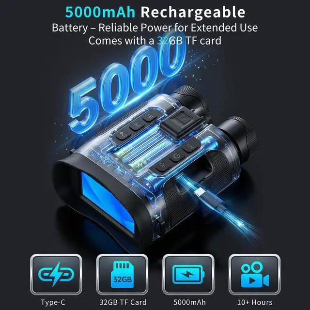 3'' Large HD DisplayNight vision goggles with a 3" screen, allowing you to view crystal-clear photos and videos.6H+ Battery Life:for All Outdoor Scenes5000mAh battery lasts over 6 hours and charges in 4H