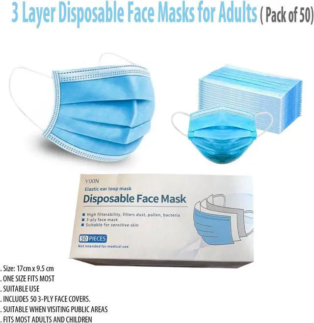 The disposable non-medical grade face mask is great for daily protection from allergens, and airborne pollutants helping you breathe easier while also protecting others from your coughs and sneezes. The 3 layer construction form these face masks are made of an outer layer of non woven fabric, a middle layer made of a filter fabric, and an inner layer made of a soft, skin gentle facial tissue. Fluid resistant, unlike cloth masks, to provide protection against large droplets or sprays of bodily fluids. Includes a comfortable design of comfortable extra soft elastic ear loops with non woven skin-friendly fibers are designed to eliminate pressure to the outer ear.