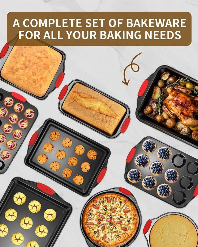 | Included Components | cake pans, cookie sheets, loaf pan, muffin pans (12 & 24 cup) with 24 cupcake liners, pizza pan |
