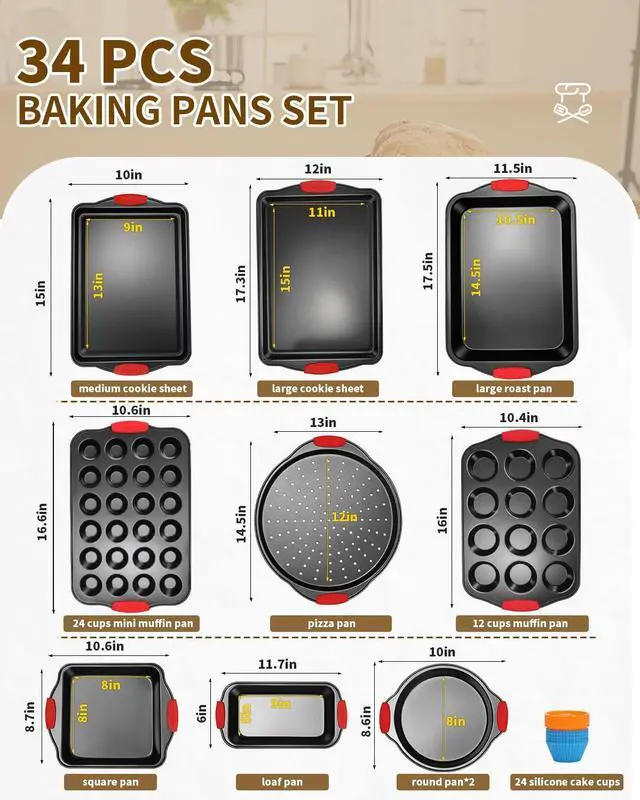 2. The size of each mold in the set is the most suitable for the actual use of home ovens -9 * 13 in & 11*15 in cookie sheets, 10.5*14.5 in roast pan, 8 in round pans*2, 5*9 in loaf pan, 10.4*16.5 in 12 cup muffin pan,10.6*16.6 in 24 cup muffin pan, 12 in pizza pan9 in square cake pan, 24 pcs silicone cake cups;