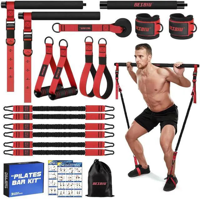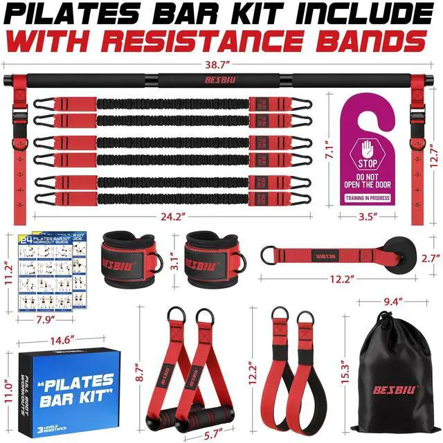 ALL IN ONE HOME GYM FITNESS EQUIPMENT -The BesBiu pilates bar kit is the most complete pilates equipment for home workouts on the market. Perfect full body workout machine of 19PCS: 1 exercise band bar+ 6 heavy duty workout bands+ 2 anti-slip soft pad handles+ 2 soft SBR material padded foot straps+ 2 thicked door anchor+ 2 adjustable padded ankle straps+ 1 pilates bar workout poster+1 warning card+1 carry bag+1 gift box. The Pilates sculpt bar kit is most friendly to those who are 5.25-6.25 feet tall for heights above. Below this height range, door anchors, handles, and ankle straps enrich your exercise methods for all people. pilates equipment with a yoga bar catering to both upper body and lower body exercises. We are quite sure that you will be super impressed with the durability, portability, versatility, and high quality of our reformer pilates machine.