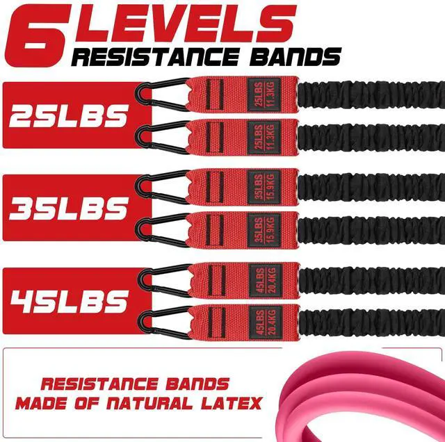 SUPERIOR SAFETY & DURABILITY EXERCISE BANDS: 6 heavy duty Resistance bands with handles for working out are made of high-grade natural latex with high-density nylon webbing and sturdy heavy metal climbing carabiners that won't break or deform. The cloth cover will slow down the oxidation speed of the latex tubes and protect our body from injury when the resistance tube snaps during use. Each length of the exercise band is 61cm(24inch), and it can be stretched to a length of 183cm (72inch). Pilates bar kit with resistance bands are ideal home gym workout equipment for men and women. The excersing bands are very stretchy, stacking or crossing the workout bands could have much more resistance tension when exercising.