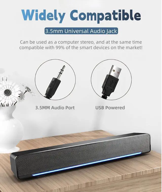 2.Wide Compatibility: With 3.5mm audio plug, it's for desktop, laptop, TV, smartphone, tablet PC, MP3, MP4 and more. USB powered design makes it easy to get power supply.