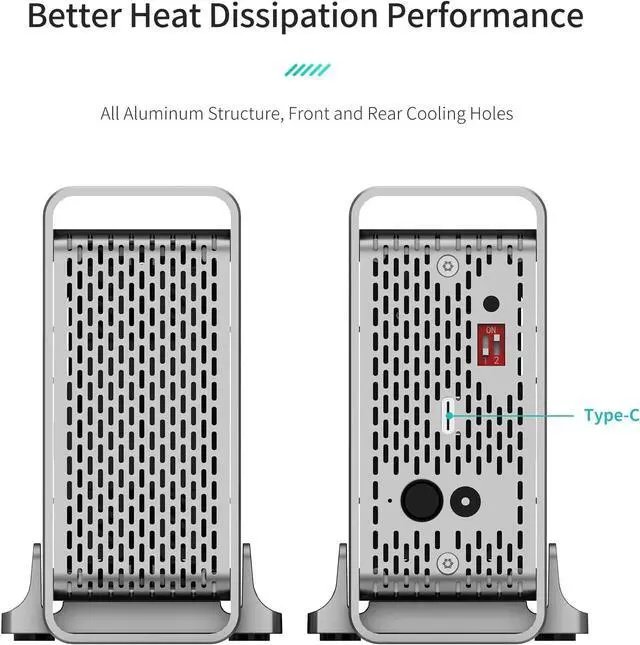Better Heat DissipationThe whole aluminum shell body and meteor radiators at the front and rear help with faster air ventilation and efficient heat dissipation. The dual bay sata hard drive caddy is made of full aluminum alloy with CNC carving and sandblast anodized surface, featuring a perfect performance against scratches, dust and shock, and providing fully protection to your hard drives.