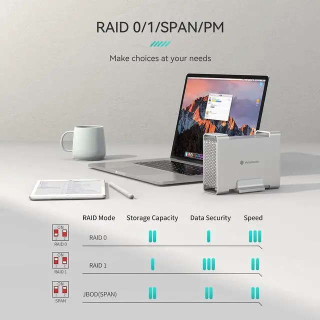Support RAID 0/1/SPANYottamaster 2 bay RAID external HDD enclosure supports 7/9/ 12.5 mm 2.5 inch hard drives with RAID 0/1/SPAN. Configure two sata disks into the 2 bay raid enclosure, you can easily set RAID modes with the sticks at the rear end. Set RAID 0 for blazing speed, RAID 1 for data security or SPAN for mass storage capacity, make choices at your needs.