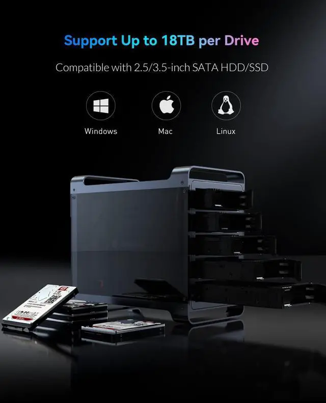 Enjoy All Games You LikeFive hard drives can be mounted in this device, support with up to 90TB large capacity. A massive collection of newest or classic games, now you can store them all together. Gamers have never had this degree of storage for what they fascinated. No longer be forced to miss out some of the truly interesting/intense games with this immense and gaming-focused external storage system.
