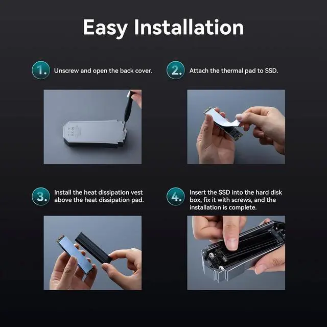 Under 53 after 24 Hours of Full WorkloadThe M. 2 NVMe Enclosure adopts the optimized "sandwich" design: Thermal Silicone pad pasted on your ssd to absorb the waste heat - Aluminum Thermal Fin covered the ssd and thermal pad(increase the heat dissipation area, with 10°C - 30°C cooling effect) - Install them into the premium aluminum enclosure. The optimized structure will cool your M. 2 SSD to a safe temp to avoid overheating and lower speed, improving the performance of your ssd.