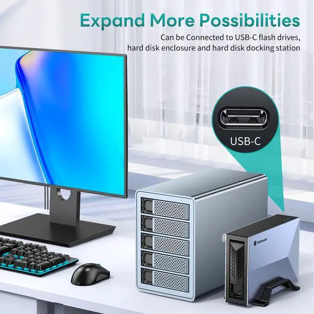 Flexible Expansion: Easily expand your NAS storage by connecting external storage devices such as USB drives, external HDDs, disk arrays, and more through the USB-C interface.