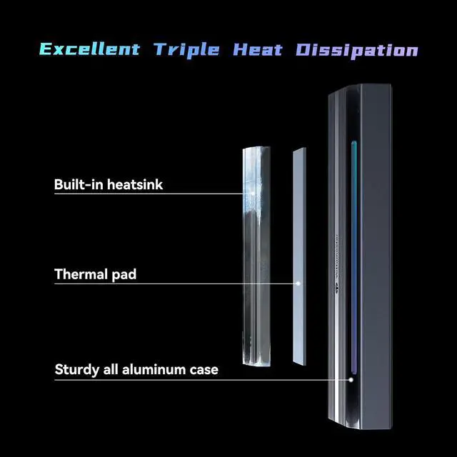 Under 53 after 24 Hours of Full WorkloadThe M. 2 NVMe Enclosure adopts the optimized "sandwich" design: Thermal Silicone pad pasted on your ssd to absorb the waste heat - Aluminum Thermal Fin covered the ssd and thermal pad(increase the heat dissipation area, with 10°C - 30°C cooling effect) - Install them into the premium aluminum enclosure. The optimized structure will cool your M. 2 SSD to a safe temp to avoid overheating and lower speed, improving the performance of your ssd.