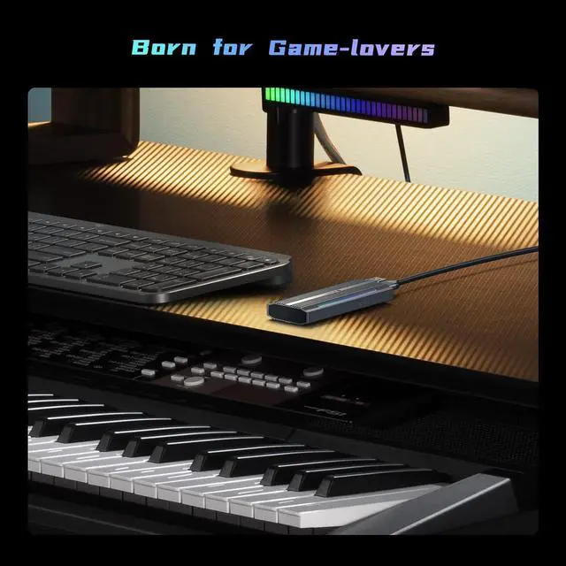 Gaming RGB NVMe EnclosureThe USB C M. 2 NVMe SSD enclsoure features with vibrant RGB light on the top for enhance your gaming setup. The gaming-inspired RGB lighting adds a stunning visual effect to your setup, creating an immersive gaming atmosphere and enhancing the aesthetics of your system.