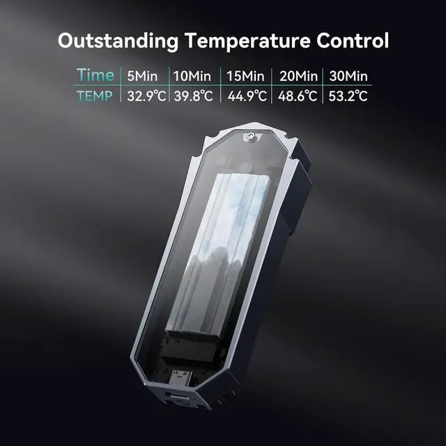 Enhanced Heat DissipationThe M. 2 NVMe Enclosure adopts the optimized "sandwich" design: Thermal Silicone pad pasted on your ssd to absorb the waste heat - Aluminum Thermal Fin covered the ssd and thermal pad(increase the heat dissipation area, with 10°C - 30°C cooling effect) - Install them into the premium aluminum enclosure. The optimized structure will cool your M. 2 SSD to a safe temp to avoid overheating and lower speed, improving the performance of your ssd.