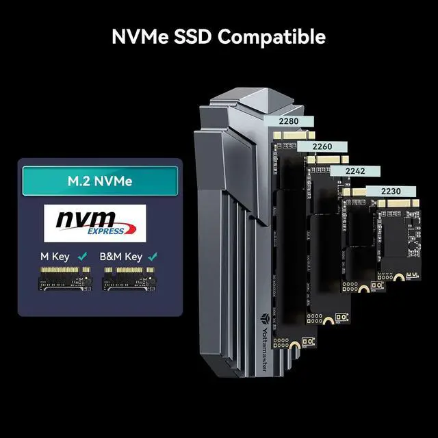 M. 2 NVMe SSD EnclosureThis M. 2 SSD Enclosure ONLY support M-Key & B&M-Key 2230/2242/2260/2280 NVMe SSDs. Supports USB 3.1 Gen2 10 Gbps transfer rate, theoretically transfer 1GB files in 1 second. The reading and writing speed up to 902MB/s and 866MB/s. Support UASP, S. M. A. R. T and TRIM. Ideal for cloning files, backing up data, reusing old M. 2 SSD, expanding storage space.