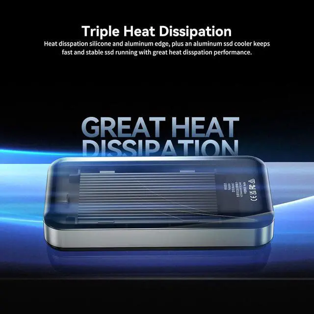 There is a silicone thermal pad on both sides of the portable ssd, plus an aluminum heatsink inside, which has strong heat dissipation performance and ensures stable data transmission.