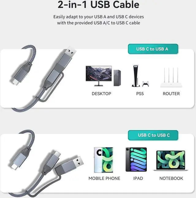 Comes with 2-IN-1 USB C to USBC/A 10Gbps cable, you can quickly access any devices with USB slots. Easily connected to your PC, Mac, smartphone or gaming console for lightning-fast access to memories, entertainment and application loads and more.