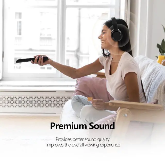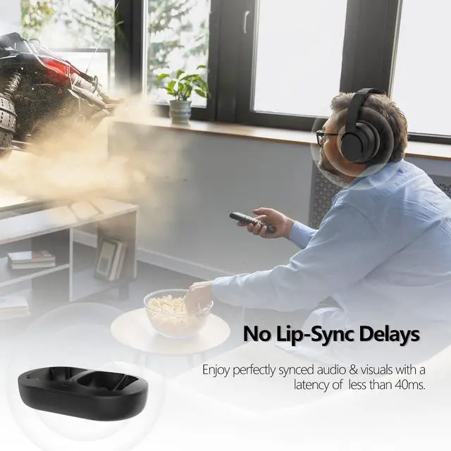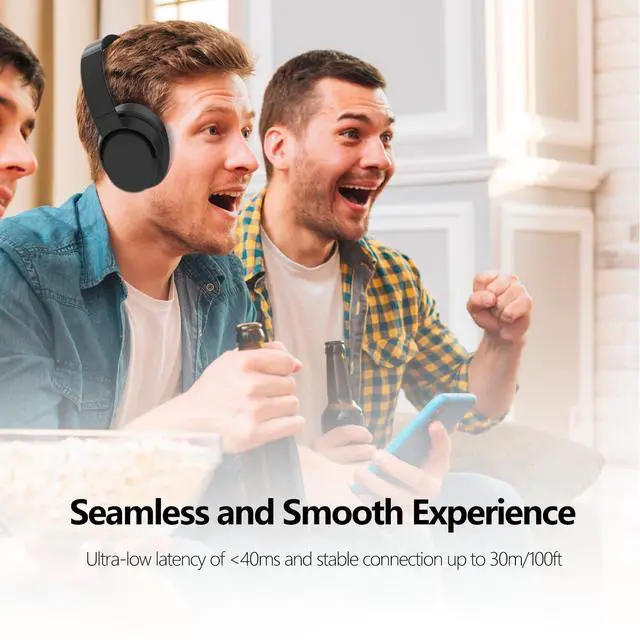 Ultra-low Latency Experience the perfect synchronization of vision and audio with our wireless headphones for TV. Your Private Oasis Use TV headphones wireless to enjoy HD original sound without worrying about disturbing your family Unlimited Freedom The 30M connection distance ensures audio is always with you, allowing freedom without boundaries Strong Battery Power With a battery life of 40 hours on this TV headphones, you can watch your favorite series or movies for a week with confidence knowing there are no limits on your audio journey! Multi-device Compatibility Not only do our wireless headphones for TV connect to your TV via the transmitter, but they can also be easily paired with other devices such as phones and tablets via Bluetooth for standalone use Compatible with All Your Devices Wireless headphones for TV can be paired with TVs, phones, and tablets, perfect for everyday use