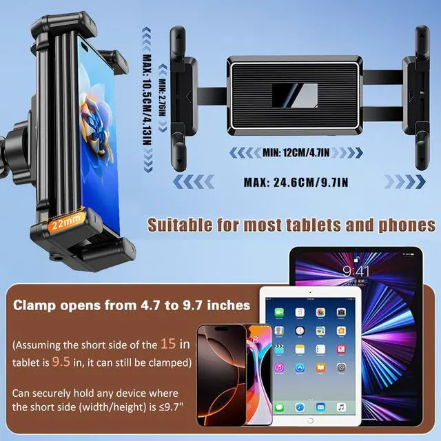 Strong Clamp Upgrade! The four clamping points of the YTDSUP fixture have been upgraded, which can not only extend left and right, but also expand up and down. When the four points are fully expanded, it will be more stable to clamp tablets. It is recommended to clamp the long side for smaller devices such as mobile phones, and the short side for larger devices such as tablets. The opening width of the fixture can reach 246 millimeters (9.7 inches). This YTDSUP upgrade bracket is suitable for Various Large-Screen Tablets and Phones
