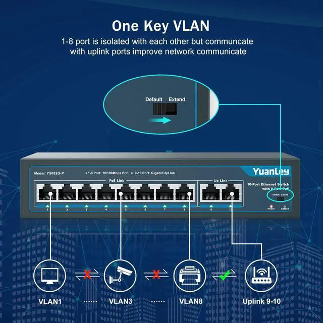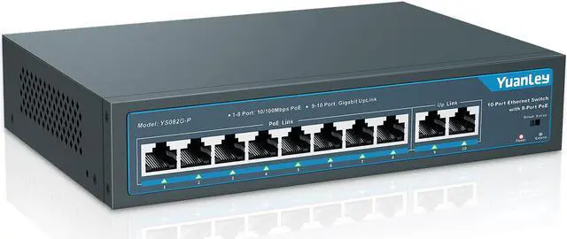 PoE Port | UpLink Port | POE Power Output | Switch Capacity | Dimensions (L x W x H) | Weight (lbs) | Extend Function | VLAN | Output Power | Metal Case | Fanless Design | Network Protocol | ||