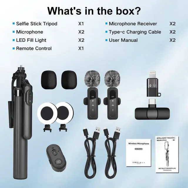 All-in-One Vlogging Kit--This vlogging kit is designed specifically for content creators on platforms such as TikTok and YouTube. The complete starter kit combines a selfie stick tripod, dual fill lights, a wireless mic, and a smart remote.Perfect for vlogging, live,streaming, and social media video creation. After turning on the fill light, press the power button three times in succession to turn off the light.