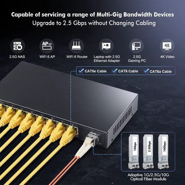1× 10Gbps SFP+ slots provide non-blocking switching performance and ultra-low latency, Compatiable with 1G/2.5G/10G SFP modules.