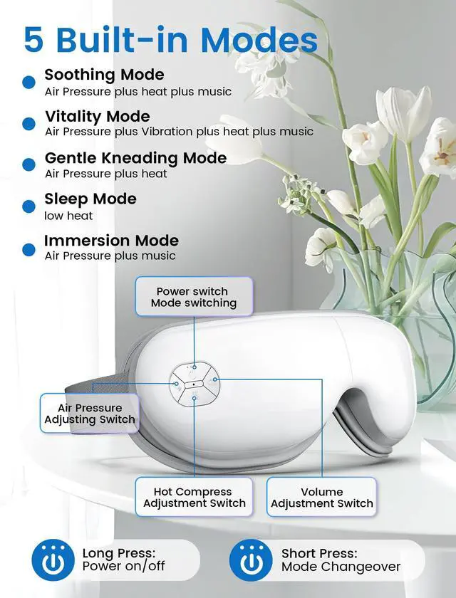 The built-in 104°-113°F (40°-45°C) far-infrared heating module safely melts away strain while stimulating tear production. Perfect for contact lens wearers and dry eye sufferers, the temperature-controlled warmth works synergistically with massage movements for deeper relaxation.