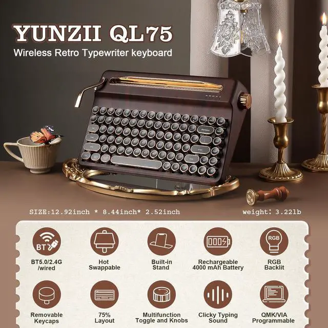 YUNZII QL75 retro keyboard features a unique typewriter-style aesthetic, tri-mode connectivity (BT/2.4GHz wireless/wired), and a built-in stand for multiple devices. Each key row of this mechanical keyboard gradually ascends in height for an ergonomic and comfortable typing experience. With the keyboard typewriter-style design, round keycaps, and pre-lubed switches, the wireless keyboard is perfect for lovers of retro keyboard and typewriter-style aesthetics.